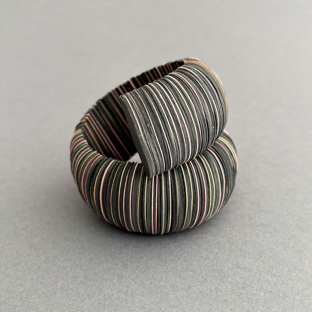Amazing color combinations for these large paper bracelets created with a striped design. Today the collection has been enriched with a new model with a exclusive design, it’s shape wraps your wrist in incredible and trendy colors. No clasp and one size.